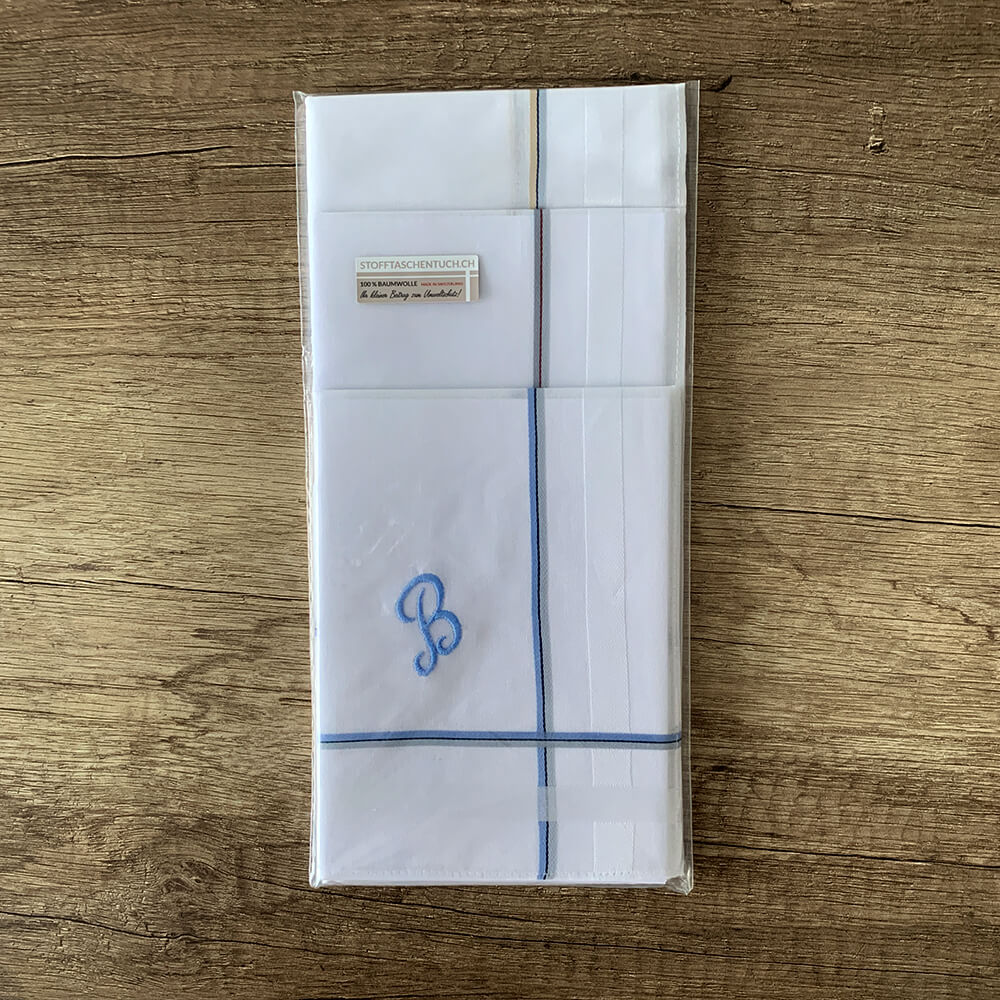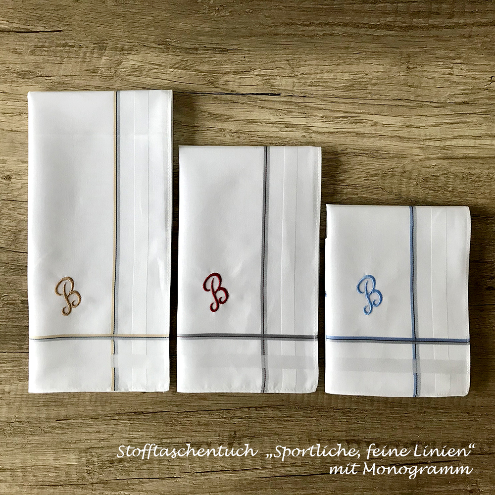Die Stoffnastücher wurden bereits mit dem Monogramm „B“ bestickt. Die Monogramme sind auf die Linienfarbe der einzelnen Taschentücher abgestimmt.