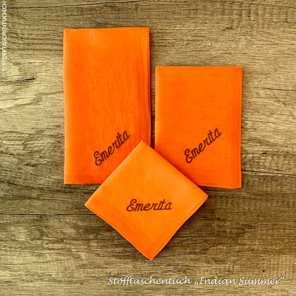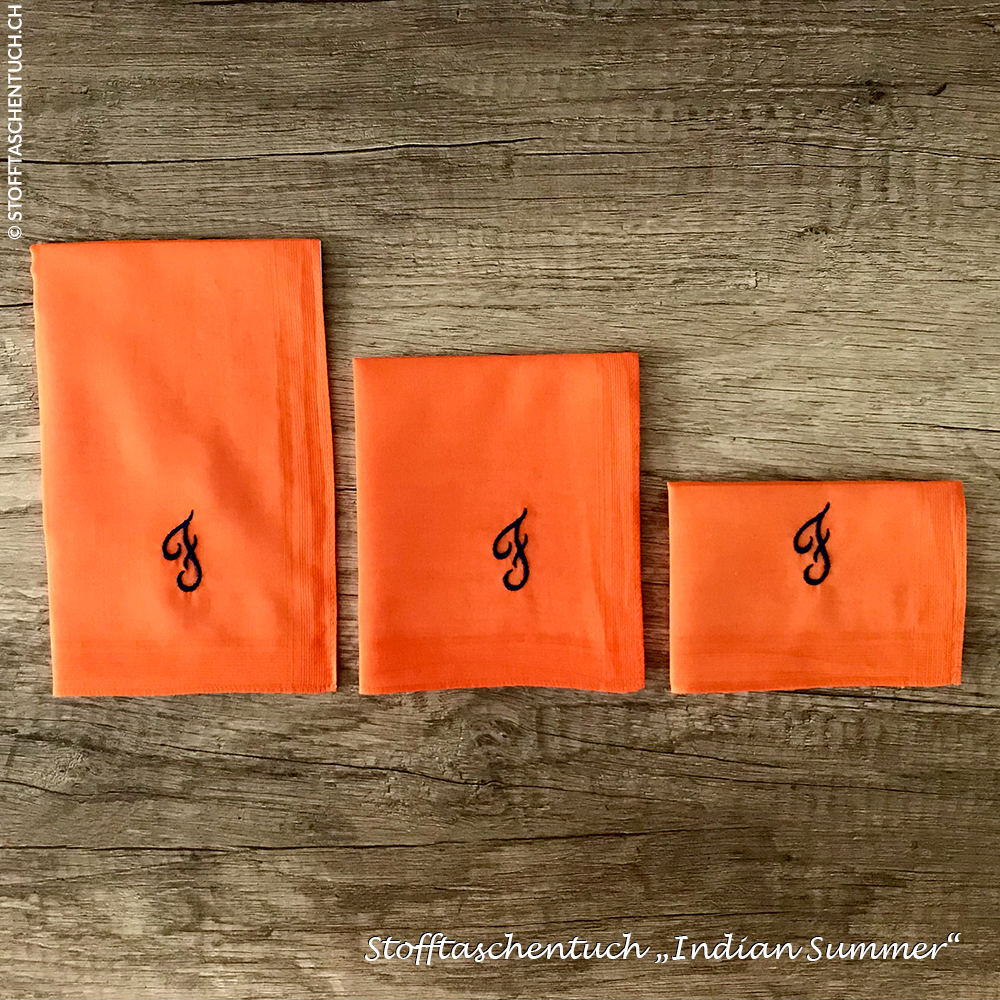 Erntereifer Kürbis, eine warme Soul-Stimme und zarte Nebelschwaden gehören zum „Altweibersommer“. Im ganzen Land verändern die Blätter der Bäume in Stadt und Wald ihre Farbe zu einem warmen Orange. Genau dieses Orange haben wir mit diesen Stofftaschentüchern eingefangen. Es erinnert an Licht, Wärme und Lebensfreude, so wie wir es auch im unverwechselbaren „Indian Summer“ und seiner besonders intensiven Blattverfärbung wieder finden.