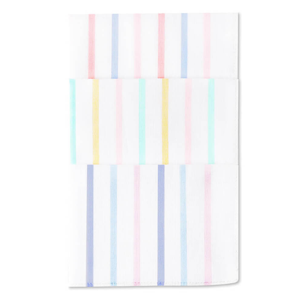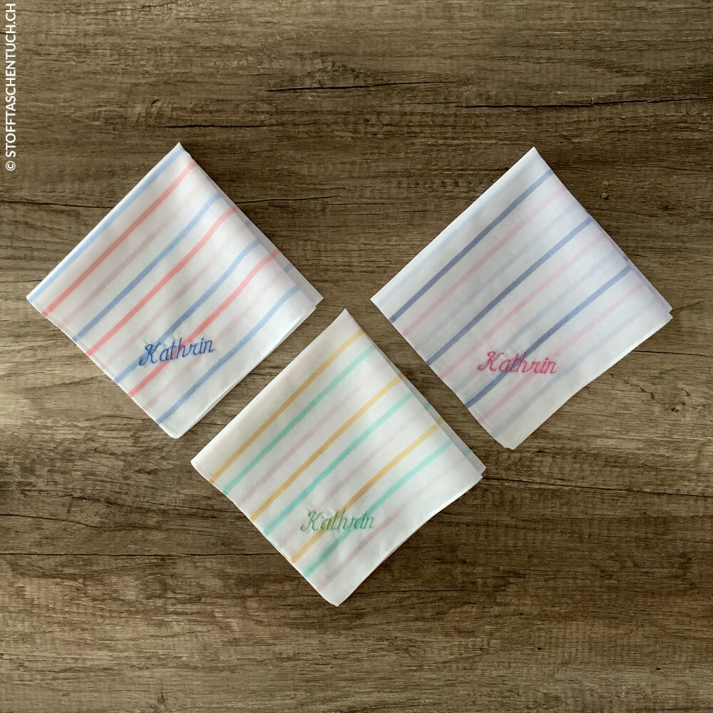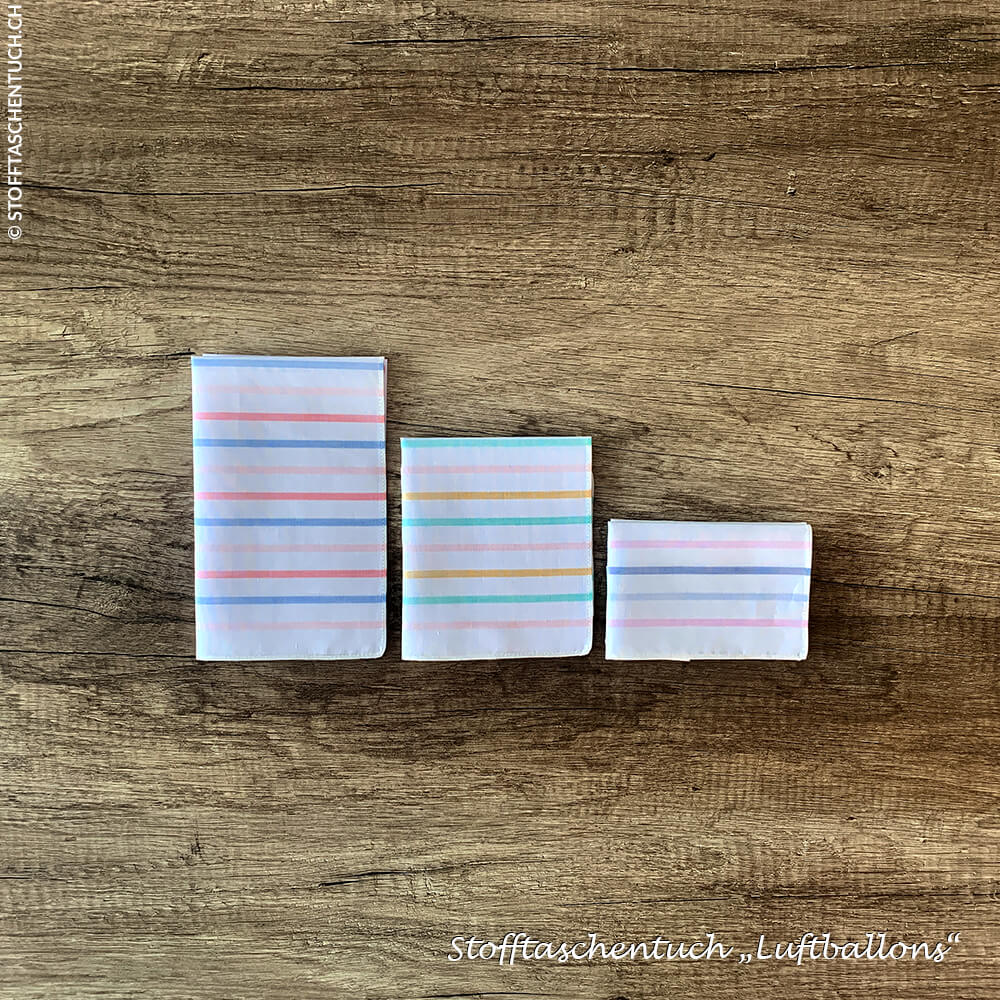 Luftballons gibt es in allen Farben. Ihre Leichtigkeit spiegeln diese lieblichen Damenstofftaschentücher mit ihren zarten Streifen in Pastelltönen wieder.