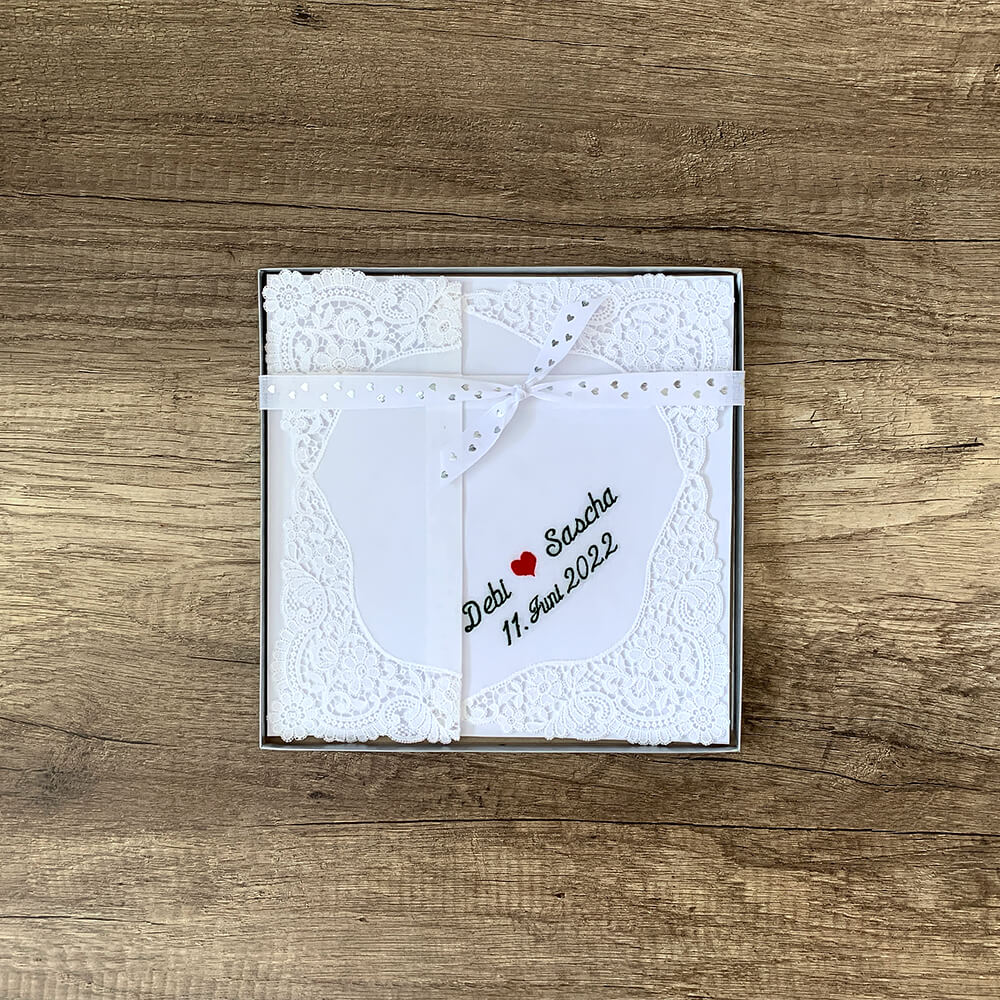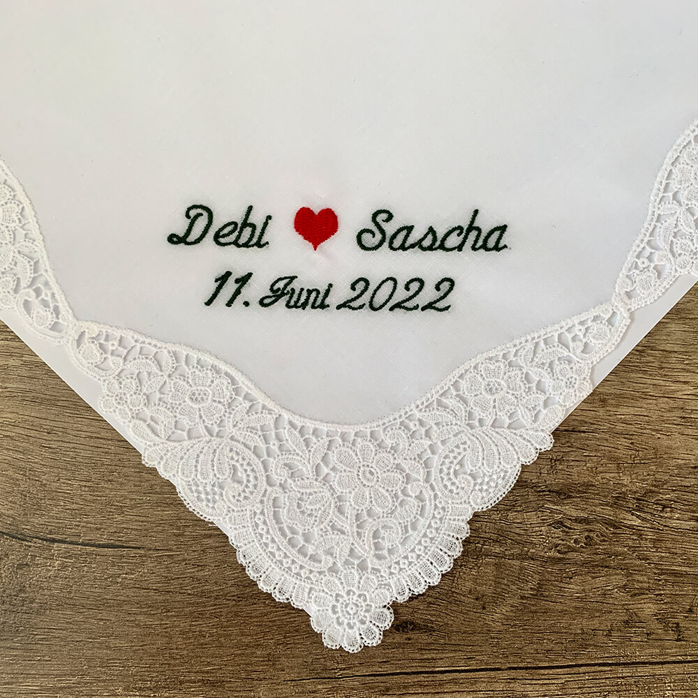 Das Taschentuch ist sehr hochwertig gearbeitet, es wird mir eine schöne Erinnerung an unsere Hochzeit bleiben. Auch die Lieferung ging blitzschnell, vielen Dank dafür!
