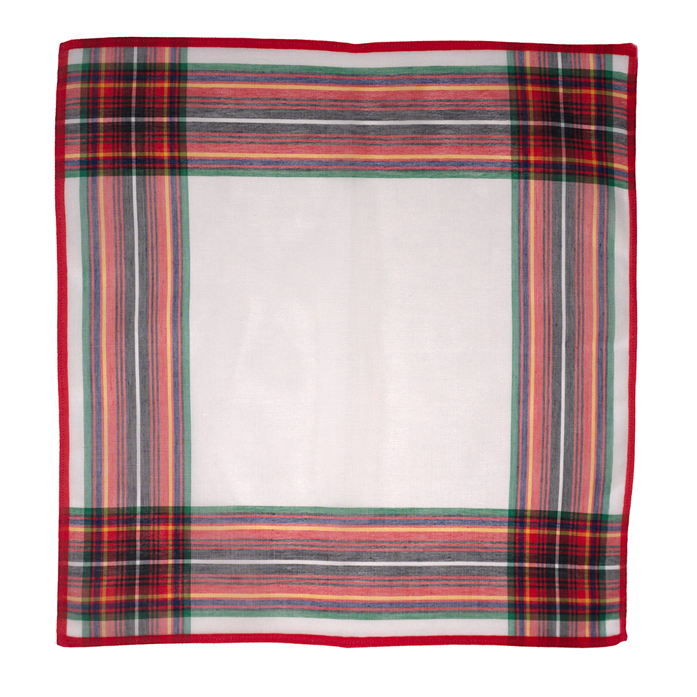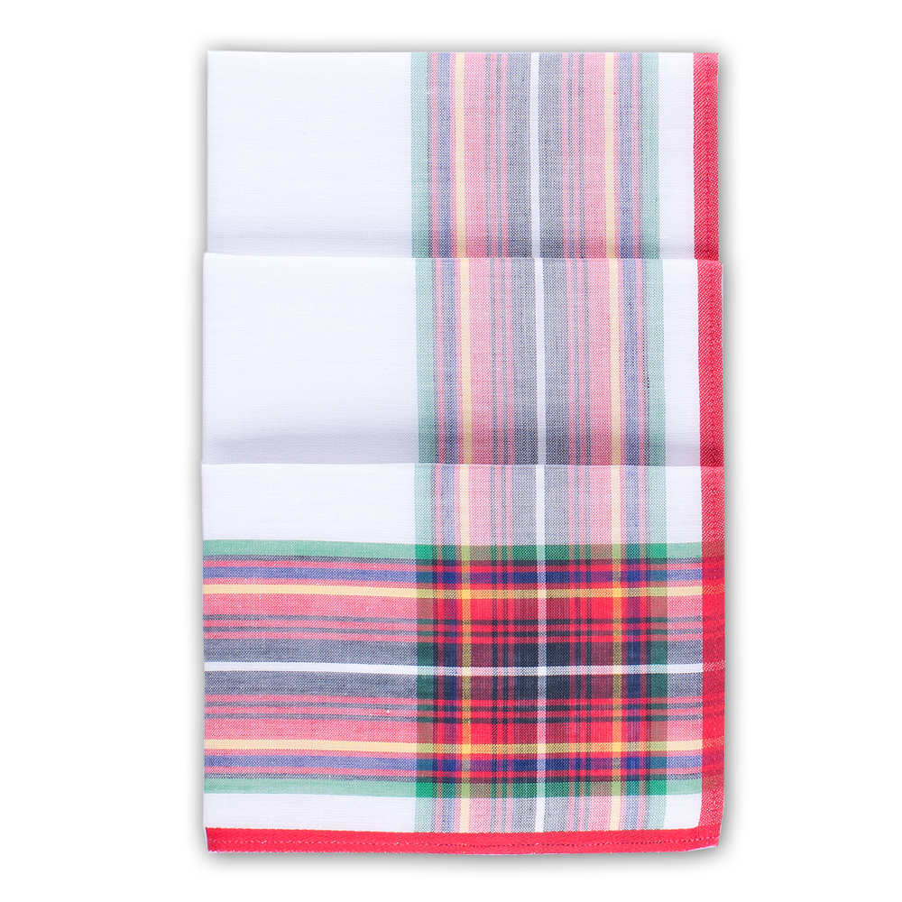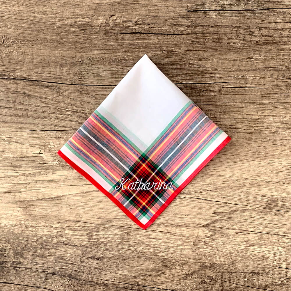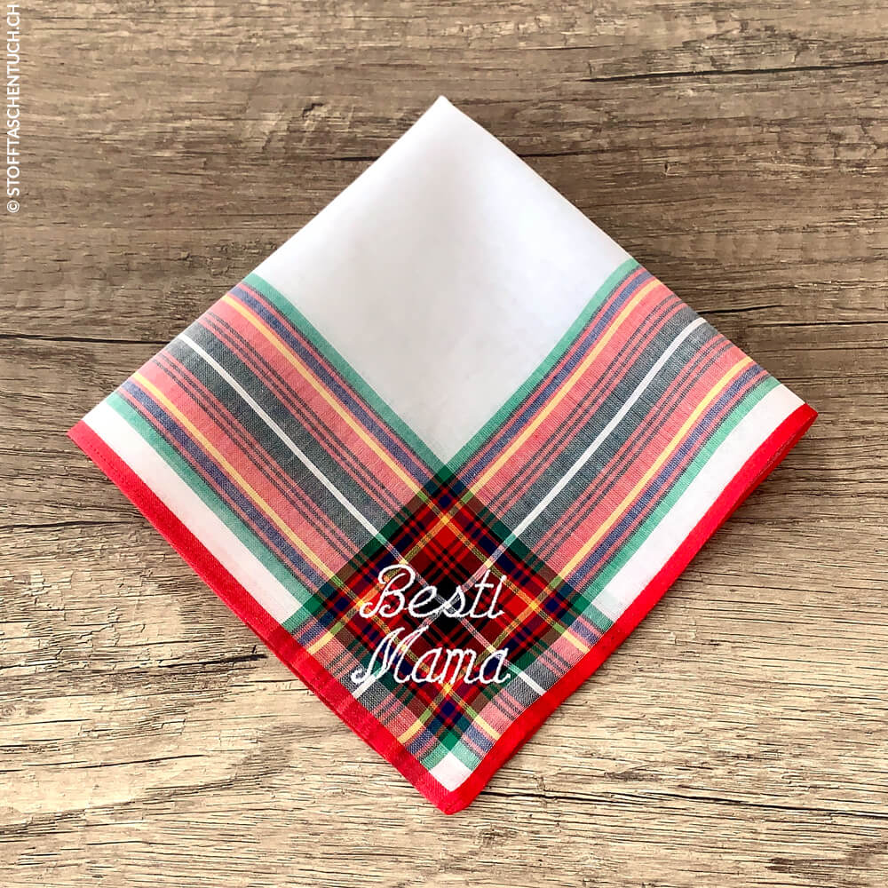 Die verschieden, farbigen Streifen in grün, rot, orange gelb und schwarz sind in den Längsstreifen transparent gewoben und rote oder orange Initialen passen perfekt zum roten Rand.