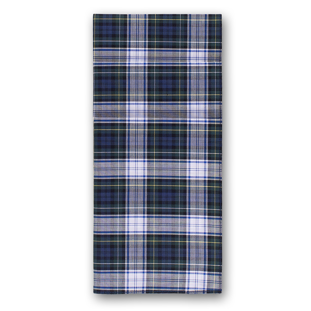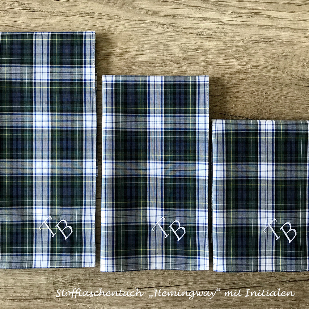 Feine blaue und gelbe Streifen geben dem Nastuch eine sportliche Anmutung, blaue und grüne Balken unterstützen den abenteuerlichen Touch, den Hemingway so liebte.