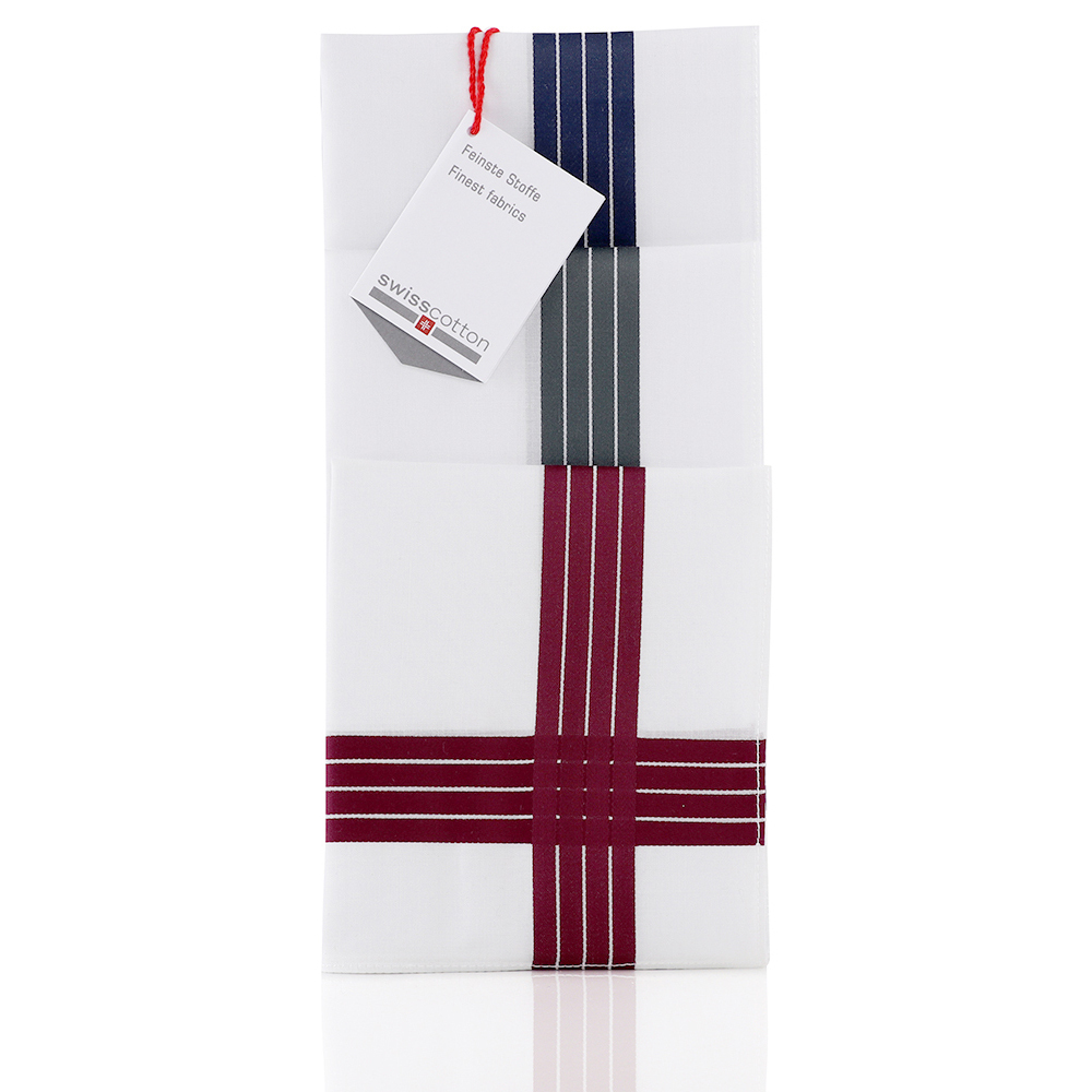 Diese Premium-Herrentaschentücher aus 100 % swiss+cotton Baumwolle stehen für höchste schweizerische Qualität. Sie unterstreichen Ihre Werte und Tradition und helfen jedem Gentleman im Bedarfsfall der Dame in seiner Begleitung, ein sauberes und frisch gebügeltes Taschentuch anzubieten. Vom besonderen Sonntagstuch des Grossvaters zum eleganten Premium-Accessoire von heute. Jedes Tuch hat 4 schmale Streifen im Satinrand in den Farben grau, weinrot oder marine blau.